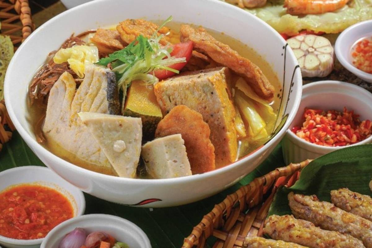 A typical Da Nang breakfast, fish cake noodles bring the sea’s flavor in every spoonful. The broth, simmered from fish bones with tomato, pineapple, and onion, is sweet and slightly sour. The chewy fish cakes—both steamed and fried—pair with fine noodles, fresh herbs, and shrimp paste for a balanced taste of salty, sweet, sour, and spicy.