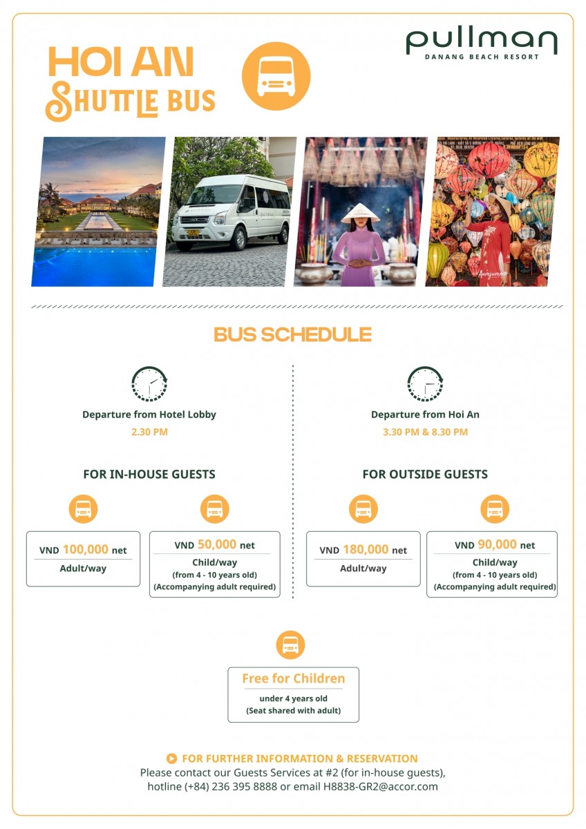 호이안 셔틀버스 서비스는 저희 리조트에서 호이안 중심부까지 편안하고 효율적으로 이동할 수 있는 방법을 제공합니다. 호이안에서는 고대 도시를 탐험하고, 맛있는 현지 음식을 즐기며, 수공예품과 기념품을 쇼핑하실 수 있습니다.
